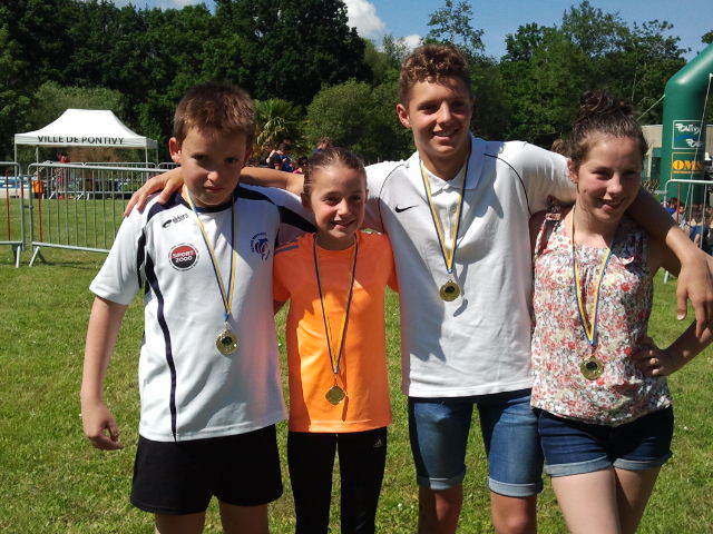 En photo, nos 4 médaillés d' or à l' aquathlon de cet après-mid. Félicitations à Lucas, Marie, Yann et Lison !